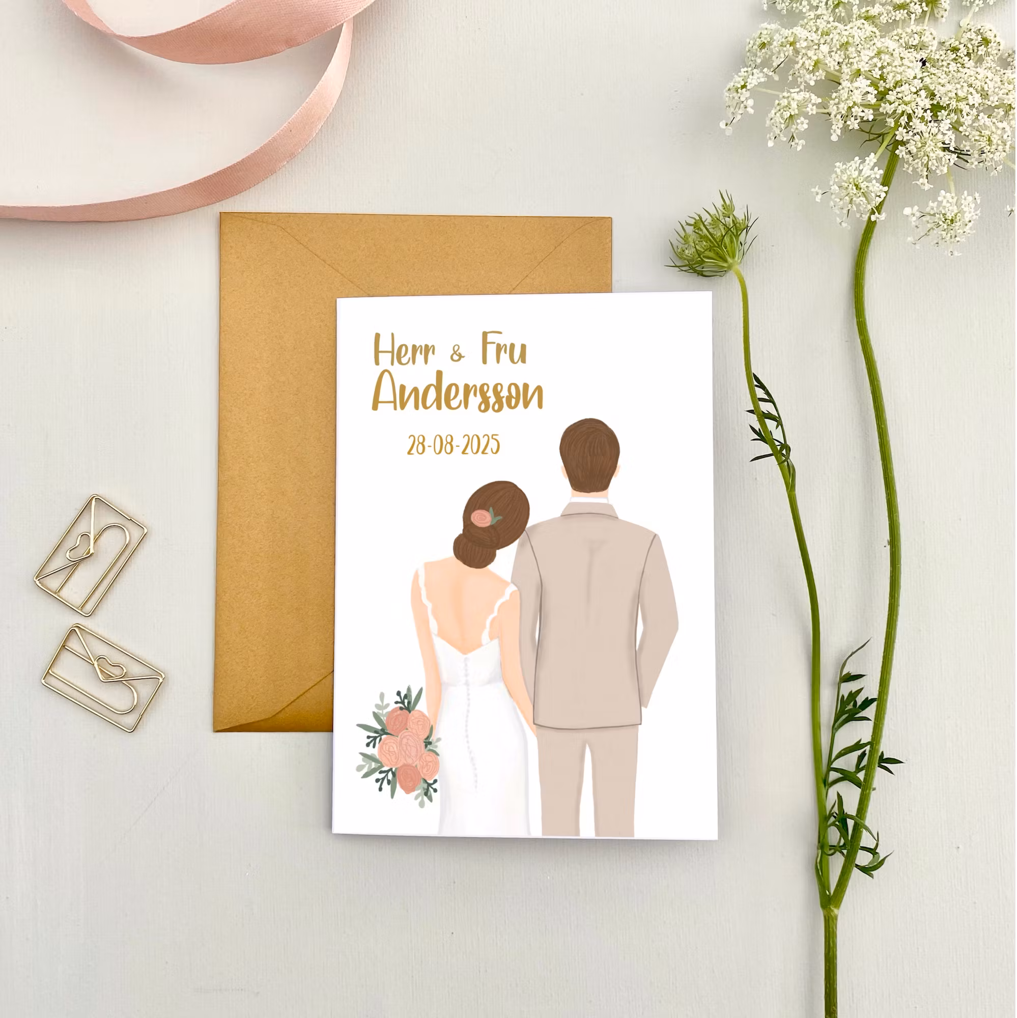 Detta vackra och personliga bröllopskort är ett illustrerat motiv av ett bröllopspar i färgpennor och har en blank insida, perfekt för att skriva ett personligt meddelande. Kortet är handgjort och utskrivet av oss själva, vilket gör varje exemplar unikt. Ett perfekt komplement till bröllopsgåvan att få ett personligt kort till den minnesvärda högtiden. Det mäter 10x14 cm och levereras tillsammans med ett elegant kuvert i guld.