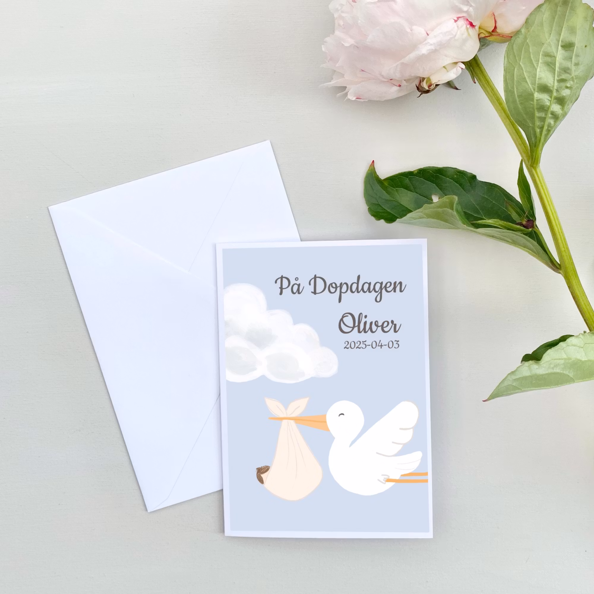 Ett personligt kort där du har möjlighet att göra det till det där extra med att sätta på namnet på bebisen du ska ge det till, som på bilden. Fint till dop eller den lilla nyfödda. Även datum kan läggas till om man önskar de, om inget fylls i kommer inte datum på kortet