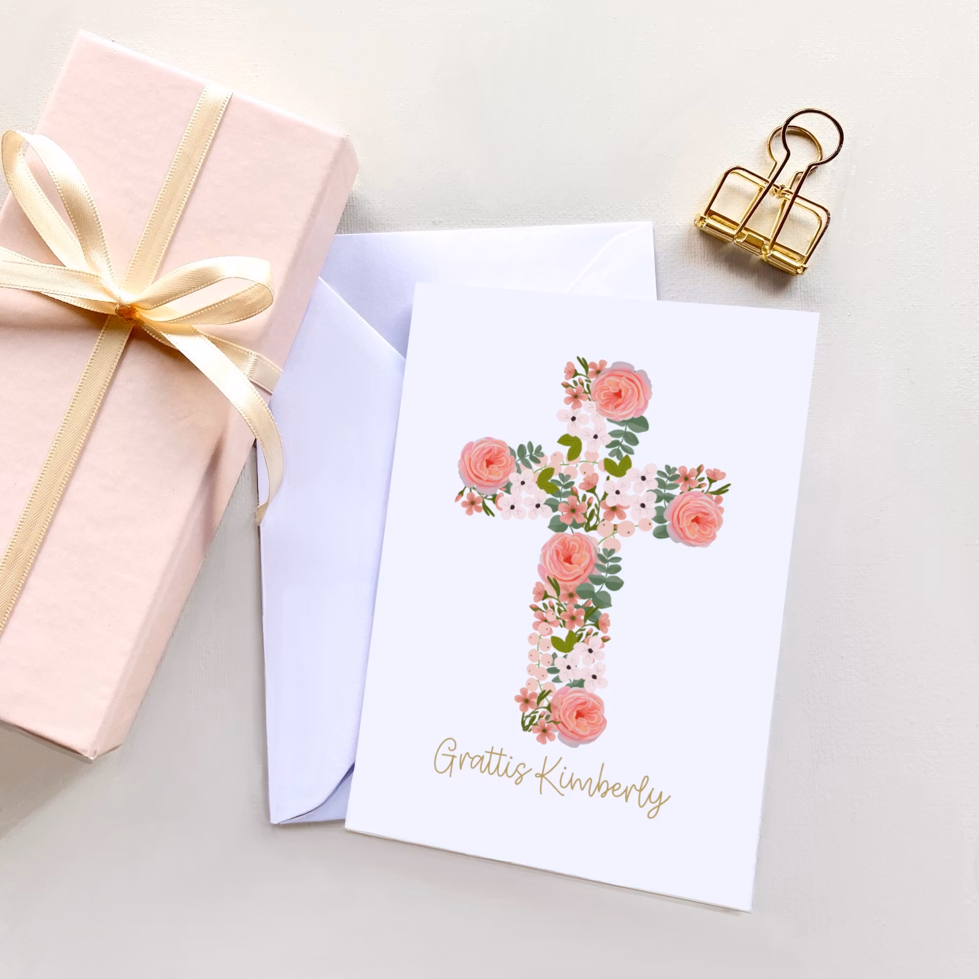 Ett personligt kort där du har möjlighet att göra det till det där extra med att sätta på namnet på konfirmanden du ska fira, som på bilden.