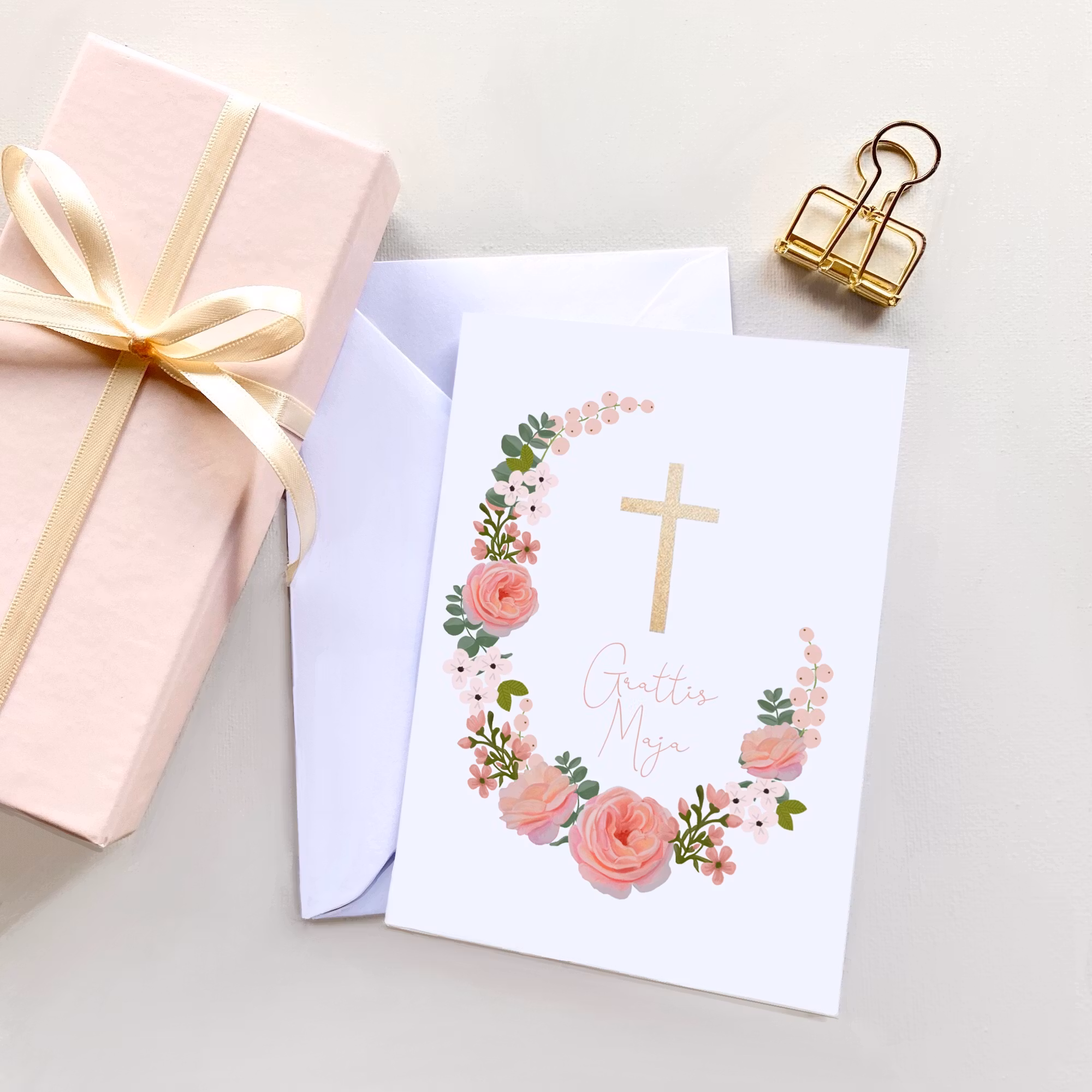 Ett personligt kort där du har möjlighet att göra det till det där extra med att sätta på namnet på konfirmanden du ska fira, som på bilden.