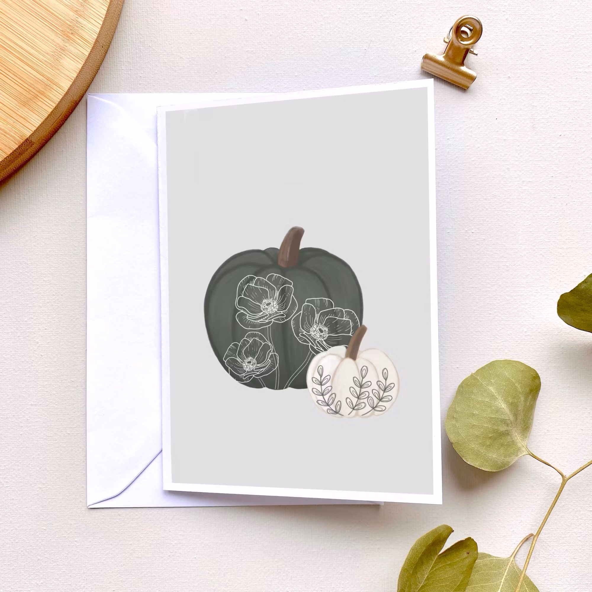 Detta vackra dubbelkort med pumpor är illustrerat med färgpennor och har en blank insida, perfekt för att skriva ett personligt meddelande. Kortet är handgjort och utskrivet av oss själva, vilket gör varje exemplar unikt. Det mäter 10x15 cm och levereras tillsammans med ett elegant vitt kuvert.
