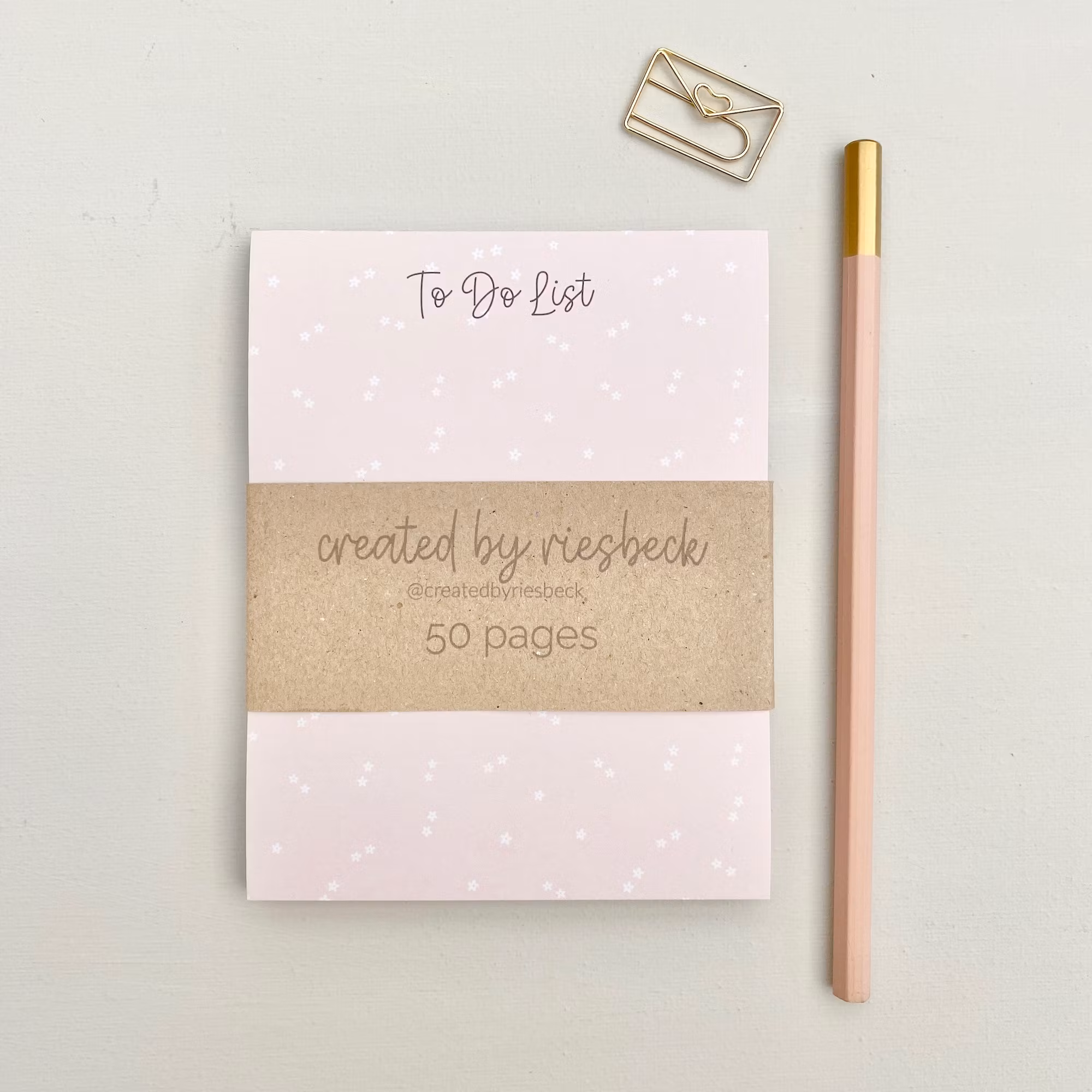 UTGÅR!! Ett rosa sött litet block i A6 format illustrerat med små vita blommor. En To Do List med 50 sidor att riva av