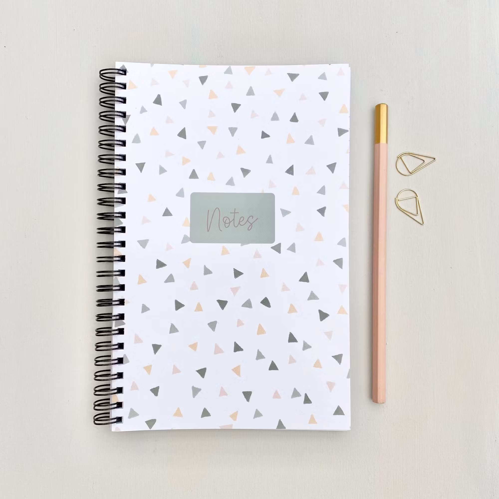 UTGÅR!! En skrivbok i A5 format med illustrerat motiv i färgpennor i mönstret Terrazzo. Mjuk pärm med glansig fram och baksida, vit på insidan och 80 linjerade sidor.